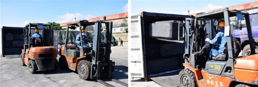 鏡頭五:散貨堆場內,工藝車隊"叉車卸運集裝箱"技術比武吸引了大量下班途中的職工駐足觀看。選手們以嫻熟的駕駛技術,將集裝箱內堆放的炭塊接連不斷地掏出,并運送至指定板車上。大家你追我趕、競賽氣氛異常激烈。