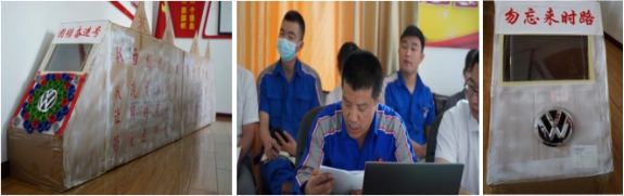 西柏坡精神是部生動的教科書,車間工人黨員袁有德利用平時裝配件的紙盒子,創意性地制做了一列"團結奮進號"火車,邀請黨員一起乘車前行。袁有德說:"團結奮進號"列車蘊含著學習西柏坡精神,強企富家、團結奮進的寓意,車頭前面的"大眾"標識代表公司經營的品牌;八個綠色的大美孚機油蓋代表八方來財,所有蓋口都向外代表招攬客戶,減少流失,而且像螺絲釘一樣牢牢釘住!車頭車尾標有"勿忘來時路"的字樣,以此提醒廣大黨員干部不忘初心、牢記使命,一定不要忘記來時的路,回顧過去,展望未來,讓"團結奮進"號列車在西柏坡精神的感召下前行。支部要求,在疫情防控和汽車行車嚴竣的形勢下,我們每一個物產汽貿員工都是新時代的答卷者,讓"團結奮進號"奔馳在新時代的征程上,承載著中國夢、物產夢,承載著物產汽貿職工群眾對美好生活的向往,風馳電掣,勇往直前,奔向未來!